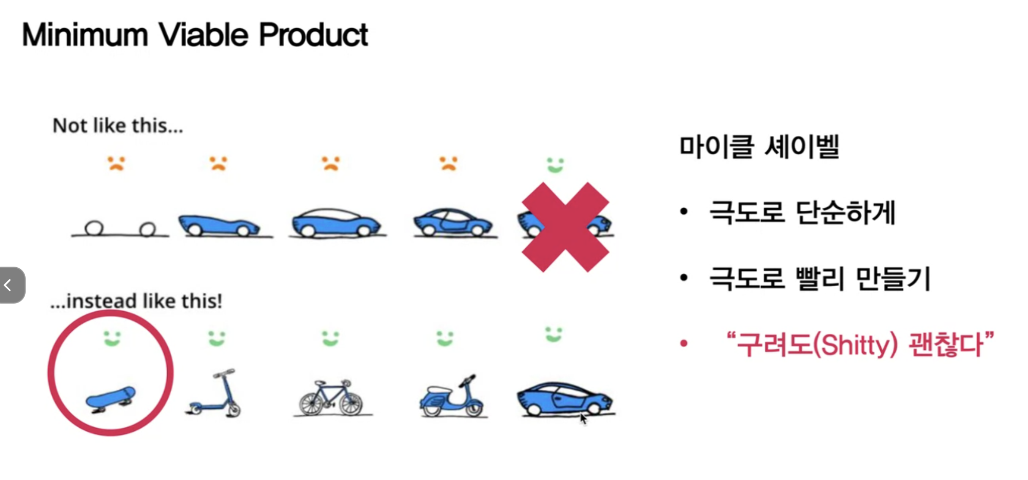 => 불티나게 팔리거나 사랑해주느 제품을 만들기 위해 정말 최소한의 기능이 담긴 제품의 피드백을 바탕으로 제품을 개선하기