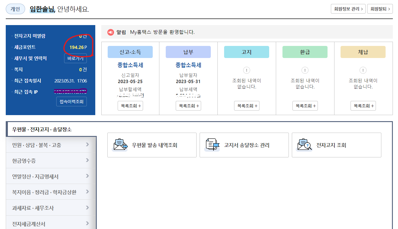 우선 사용하기 전에 홈택스에서 내 세금포인트를 조회해보았다.