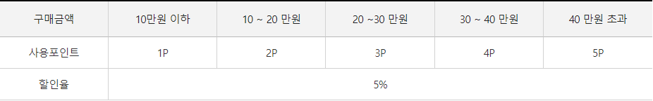 할인율은 모두 동일하게 5%이고, 결제금액에 따라 사용되는 포인트가 올라가는 방식이다.