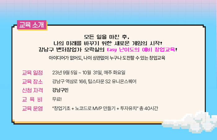 강남구 미래산업 취창업 아카데미 <벤처창업 스타트업 오락실!> 이라는 교육 겸 네트워킹 프로그램인데,