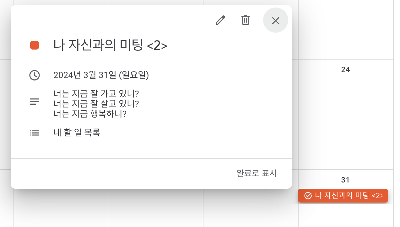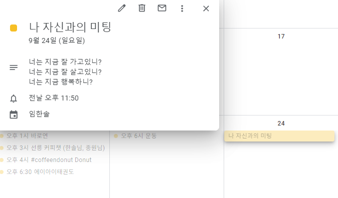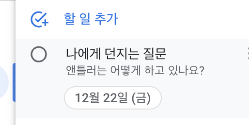 나는 이 행위에 Google Tasks 를 쓴다. 구글 캘린더에서 "할 일" 을 생성하면 자동으로 Tasks 에 들어가게 되고 이런 식으로 보인다.