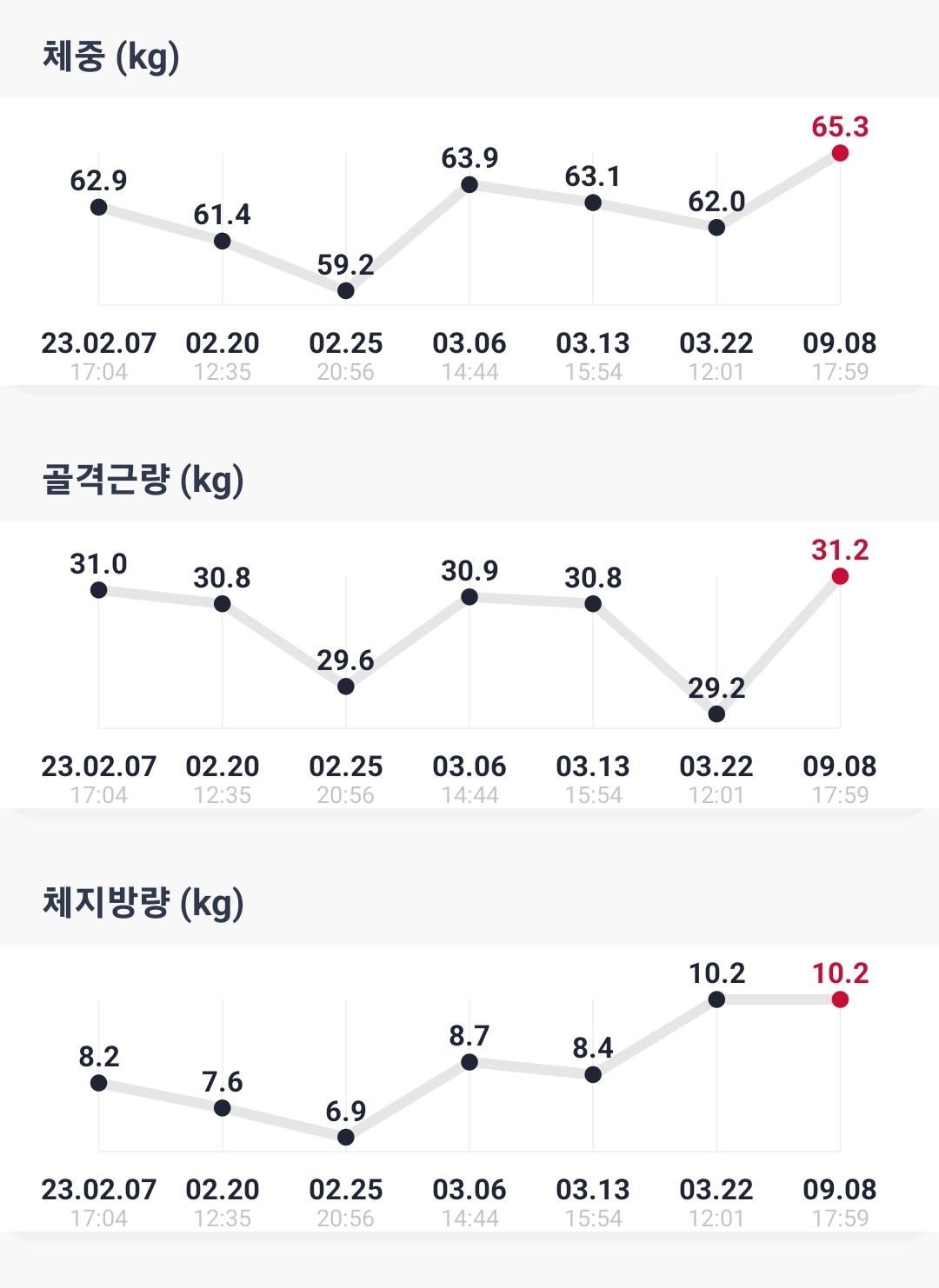 바디프로필이 2월 26일이었고 이후에 골격근량은 올랐으며 체지방률은 정상치를 유지하고 있다.