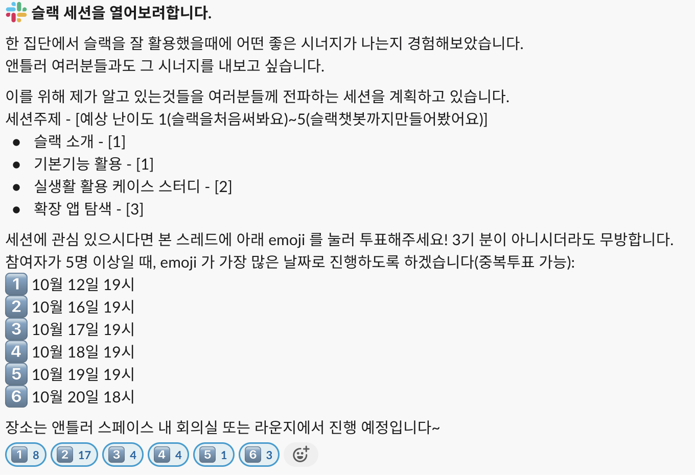 난 어제 3기에서 슬랙세션을 해보기로 맘먹었고 적지 않은 관심을 얻었다.