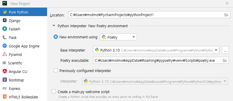 PyCharm 에서 새로운 Pure Python 프로젝트를 생성한다.